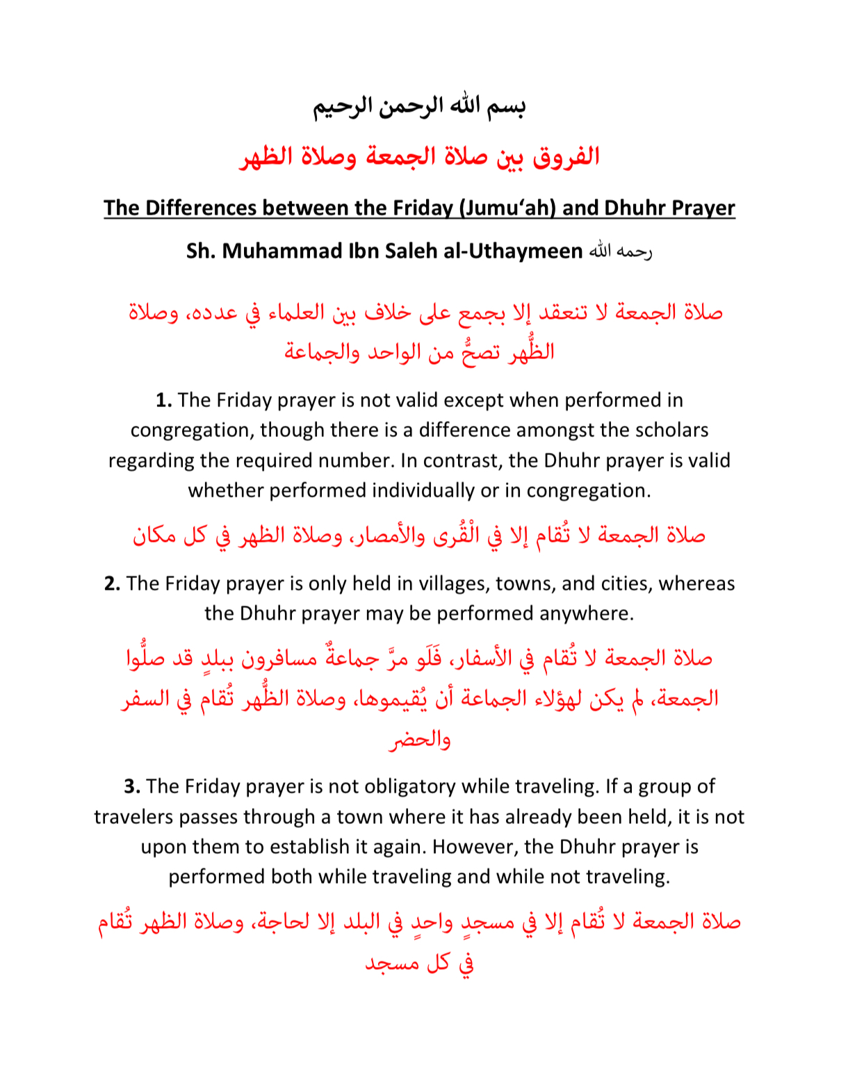 The Differences between the Friday (Jumu‘ah) and Dhuhr Prayer – Muhammad Ibn Saleh al-Uthaymeen